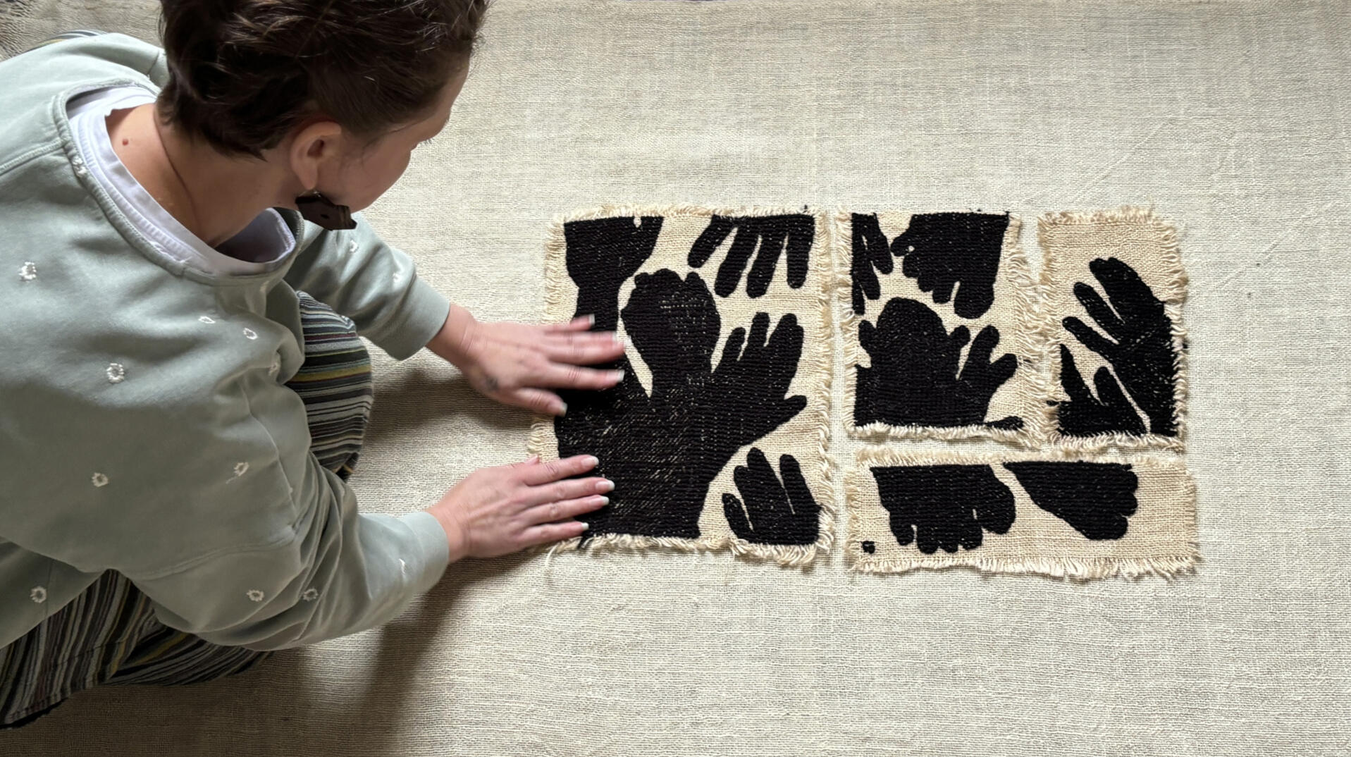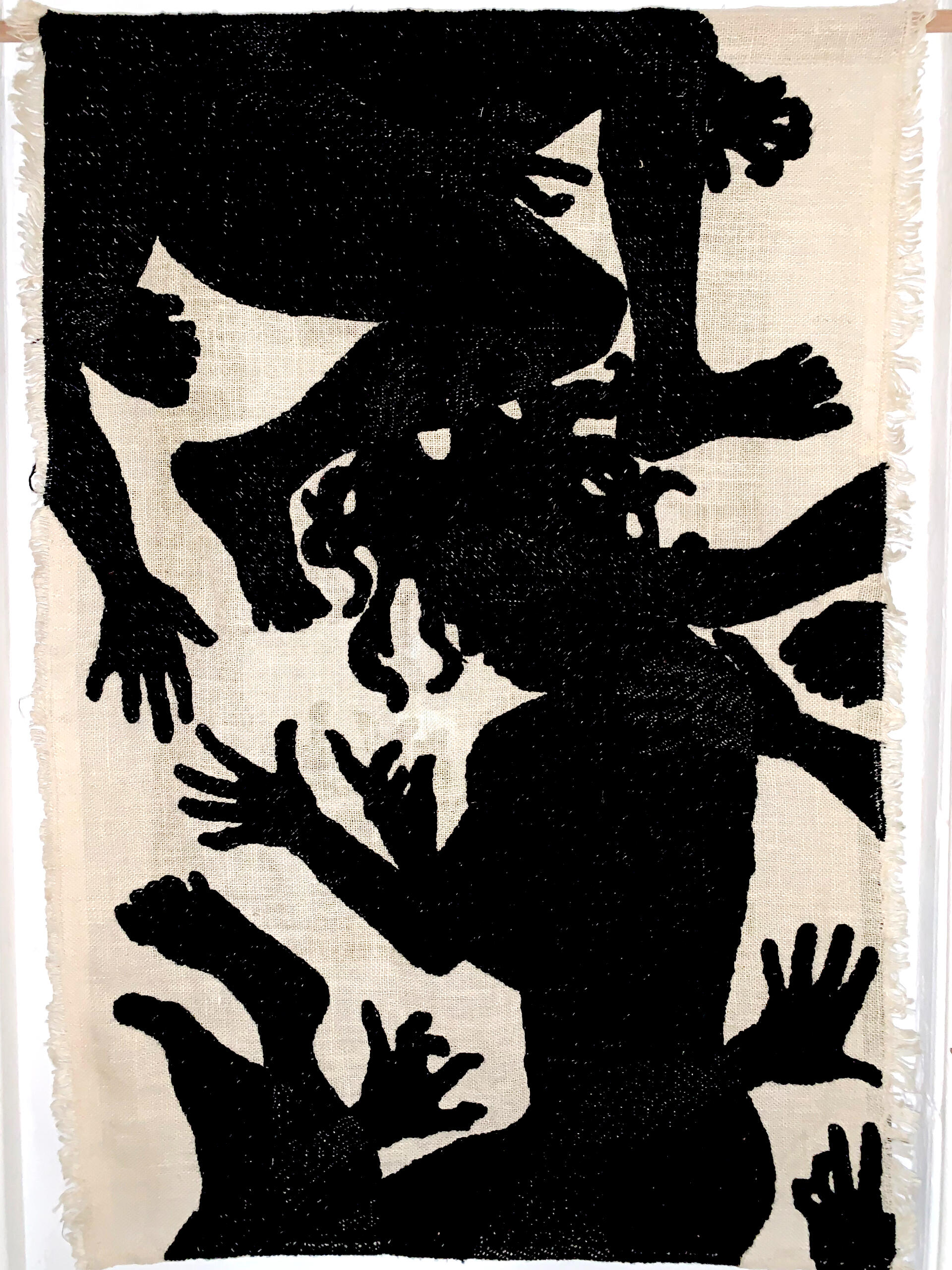 Turning my anger into something constructive, I delved into the various stitches of Borschiv embroidery, creating my own ornament as a symbol of mourning for the lives lost, body parts severed, and souls scarred. Embroidering black silhouettes of bodies, hands, and feet on coarse hemp canvas using synthetic wool, I painted my grief onto the canvases, disregarding conventional norms.This practice has provided ample room for reflection, research, and self-discovery, liberating my identity from the constraints of relativistic theories.