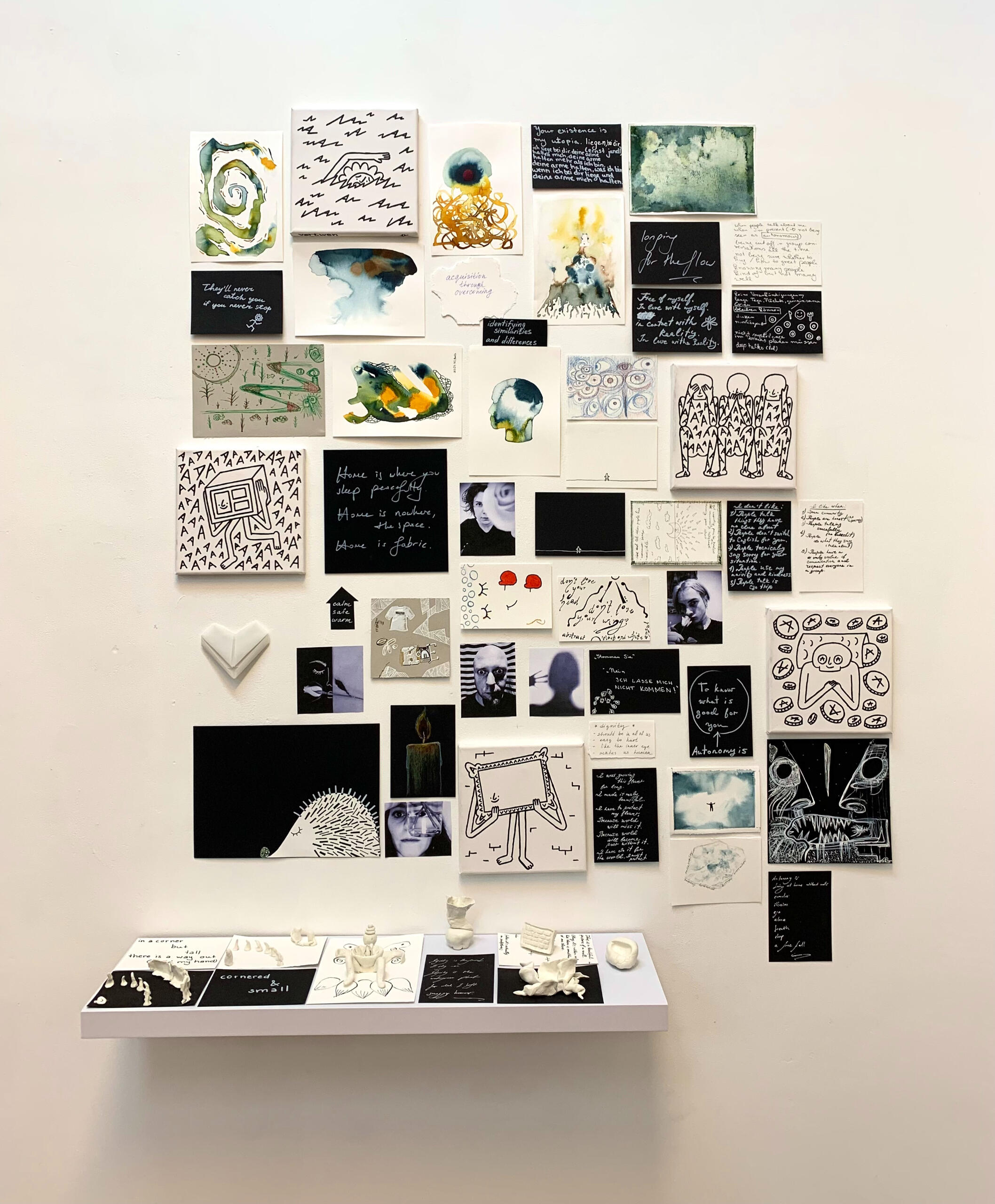Each session centred around a different theme—home, travel, neighbourhood, autonomy, and dignity—which we explored through conversation and collaborative practice. The gallery rooms became a cooperative studio space for myself and six Berlin-based artists: four Ukrainians and two artists originally from Turkey and Iran.At the exhibition titled “Autonomy and Dignity”, we presented the artists’ works alongside their personal reflections on the process. In addition, we co-authored a Common Statement on dignity and autonomy. During the public events, we invited the audience to contribute their own thoughts to this collective statement, creating a shared space of dialogue and expression.